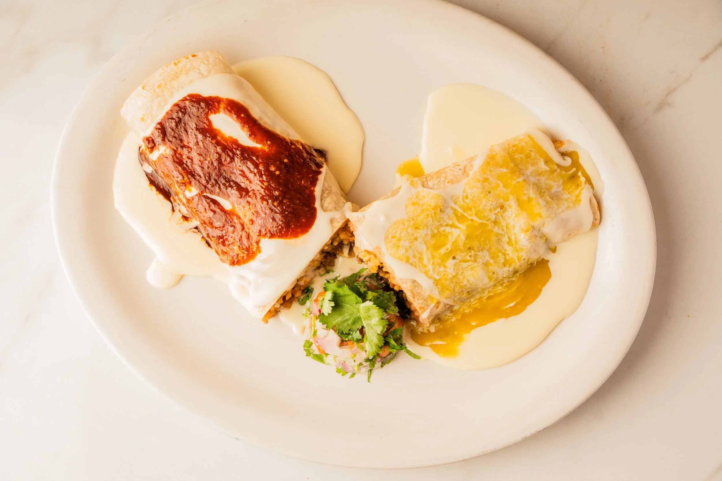 Top-down photo of The Woodstock Burrito cut in half and topped with queso, red salsa, and salsa verde, served with fresh pico de gallo at The Corner Street Taco Bar in Woodstock, GA.