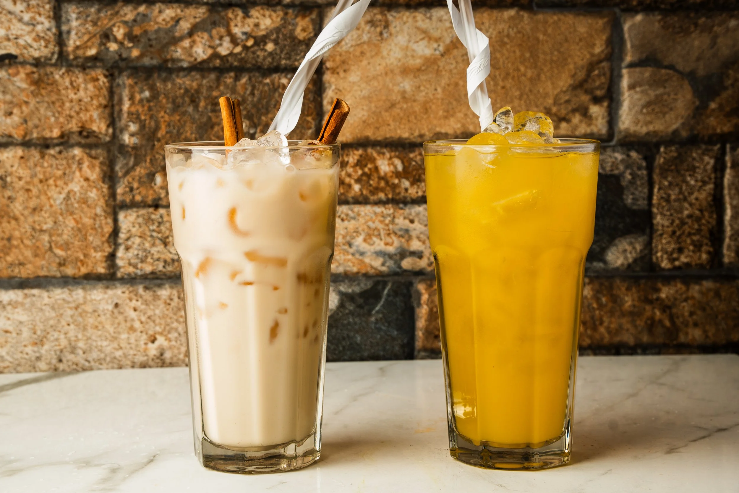 Glass of creamy Mexican horchata garnished with a cinnamon stick, served chilled at The Corner Street Taco Bar in Woodstock, GA.
