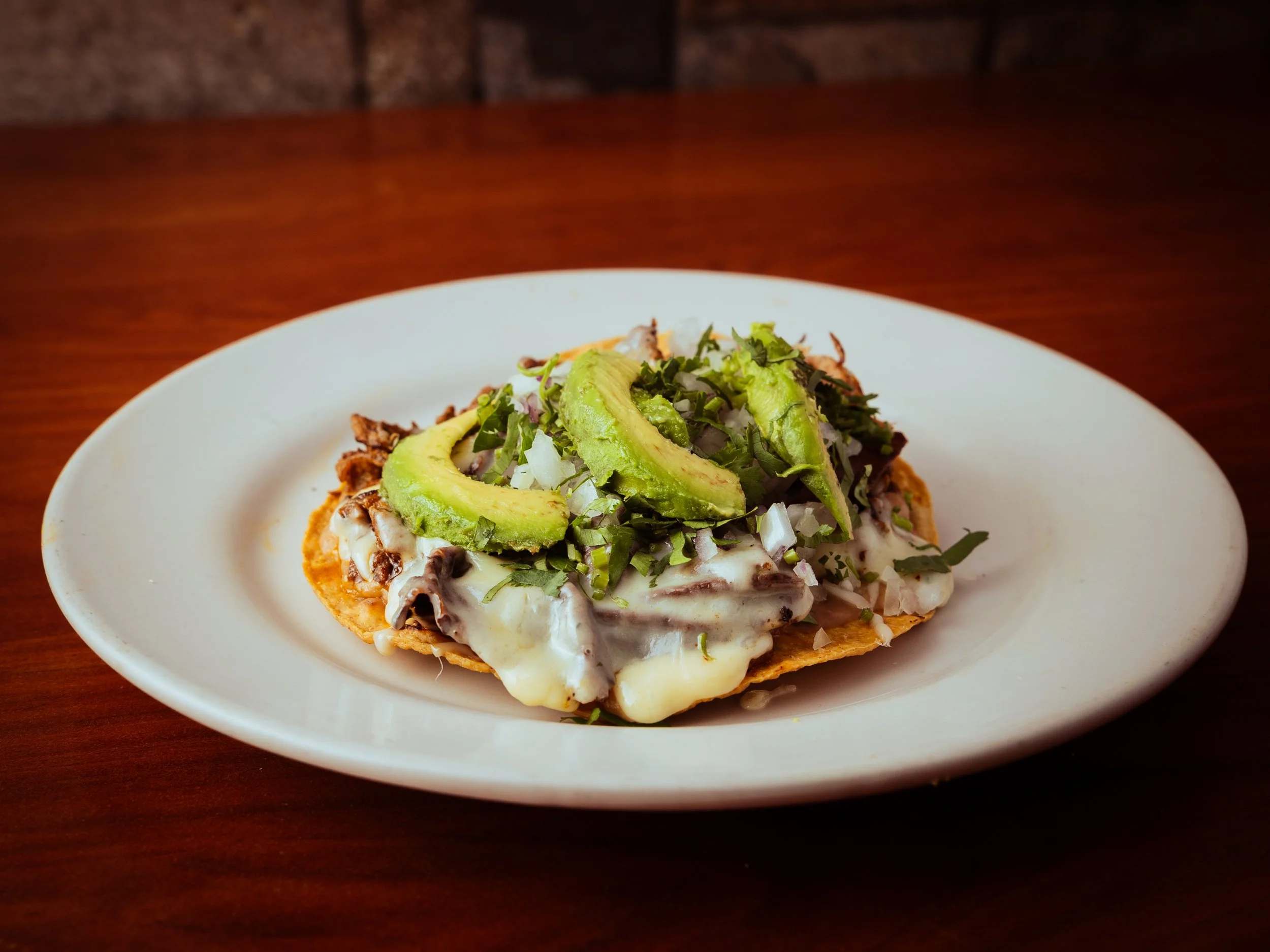 Close-up of Volcanes topped with melted Oaxaca cheese, grilled steak, avocado, cilantro, onions, beans, and crispy bacon at The Corner Street Taco Bar in Woodstock, GA.